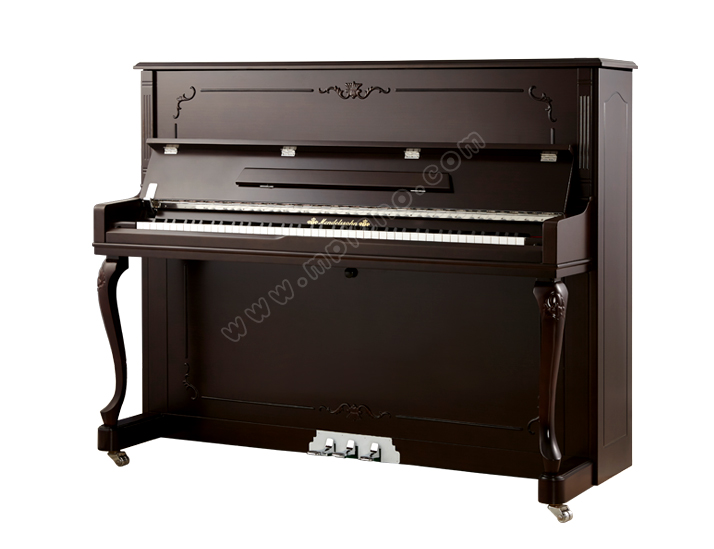胡桃木色亞光琴身,大搖蓋,單琴耳,小譜架,大弧形彎腿雕有線形花紋,上、下門刻有精致的花枝、花蔓,盡顯浪漫、優(yōu)雅。