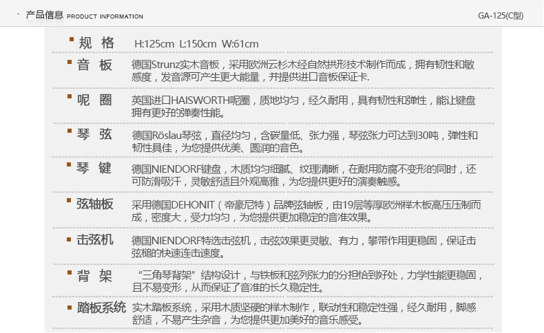 背架:獨(dú)有的 “三角琴背架”專利結(jié)構(gòu)設(shè)計(jì),與鐵板和弦列張力的分擔(dān)恰到好處,力學(xué)性能更穩(wěn)固,且不易變形,從而保證了音準(zhǔn)的長久穩(wěn)定性。