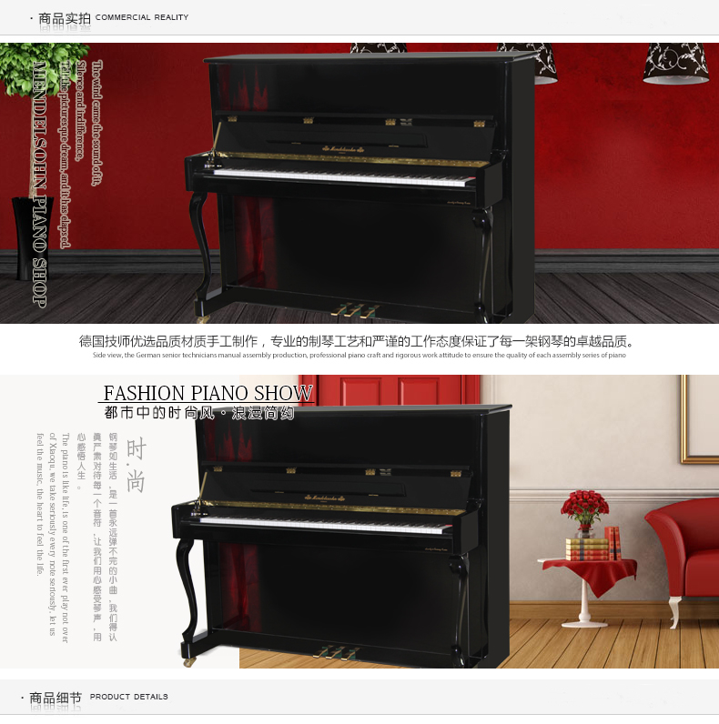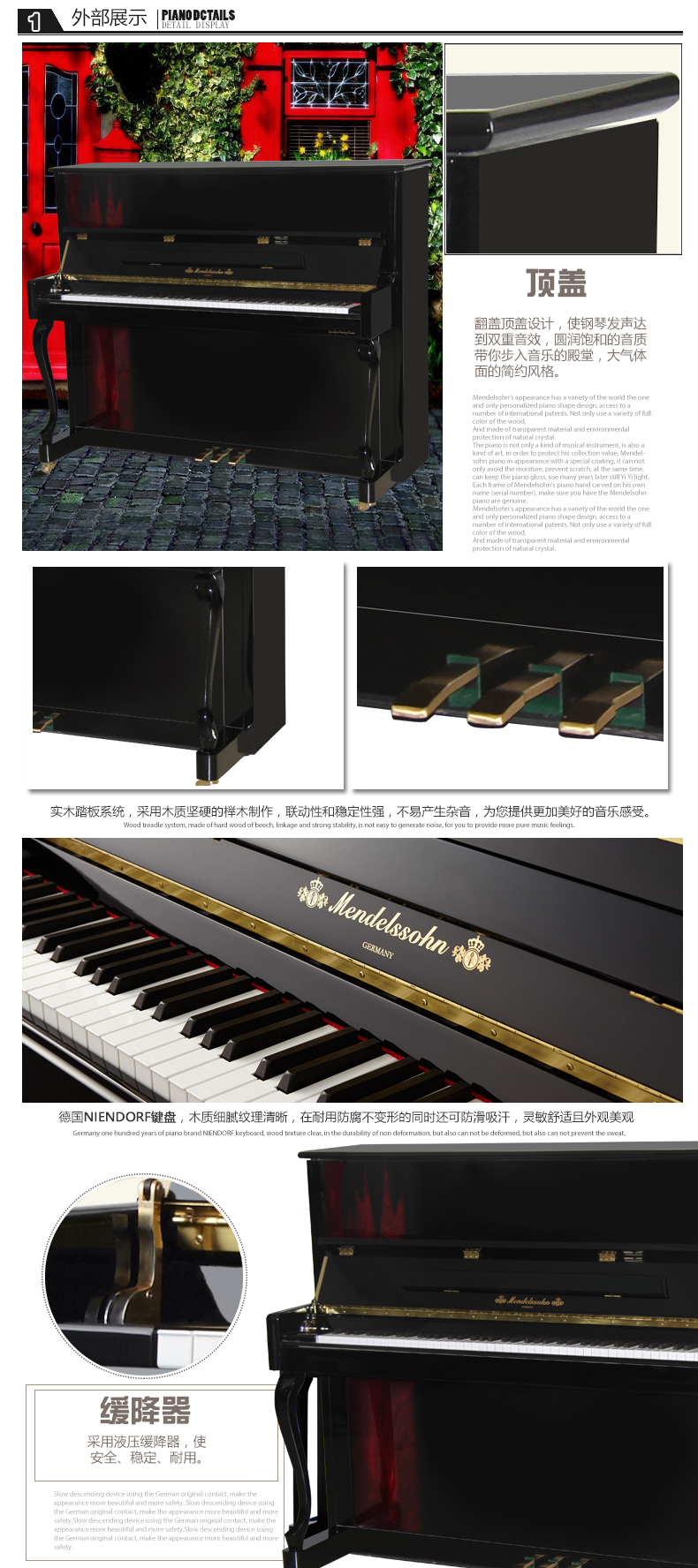 采用彰顯尊貴的歐式外型設(shè)計(jì),精選高品質(zhì)材質(zhì),雅致外觀與超凡音質(zhì)相結(jié)合。德國高級技師手工組裝制作,專業(yè)的制琴工藝和嚴(yán)謹(jǐn) 的工作態(tài)度保證了每一架進(jìn)口系列鋼琴的卓越品質(zhì)。同時,每一架進(jìn)口系列鋼琴在出廠時都須經(jīng)過嚴(yán)格的檢驗(yàn)、調(diào)試、整理,保證每位 使用者都能感受到它的純真的音質(zhì)。