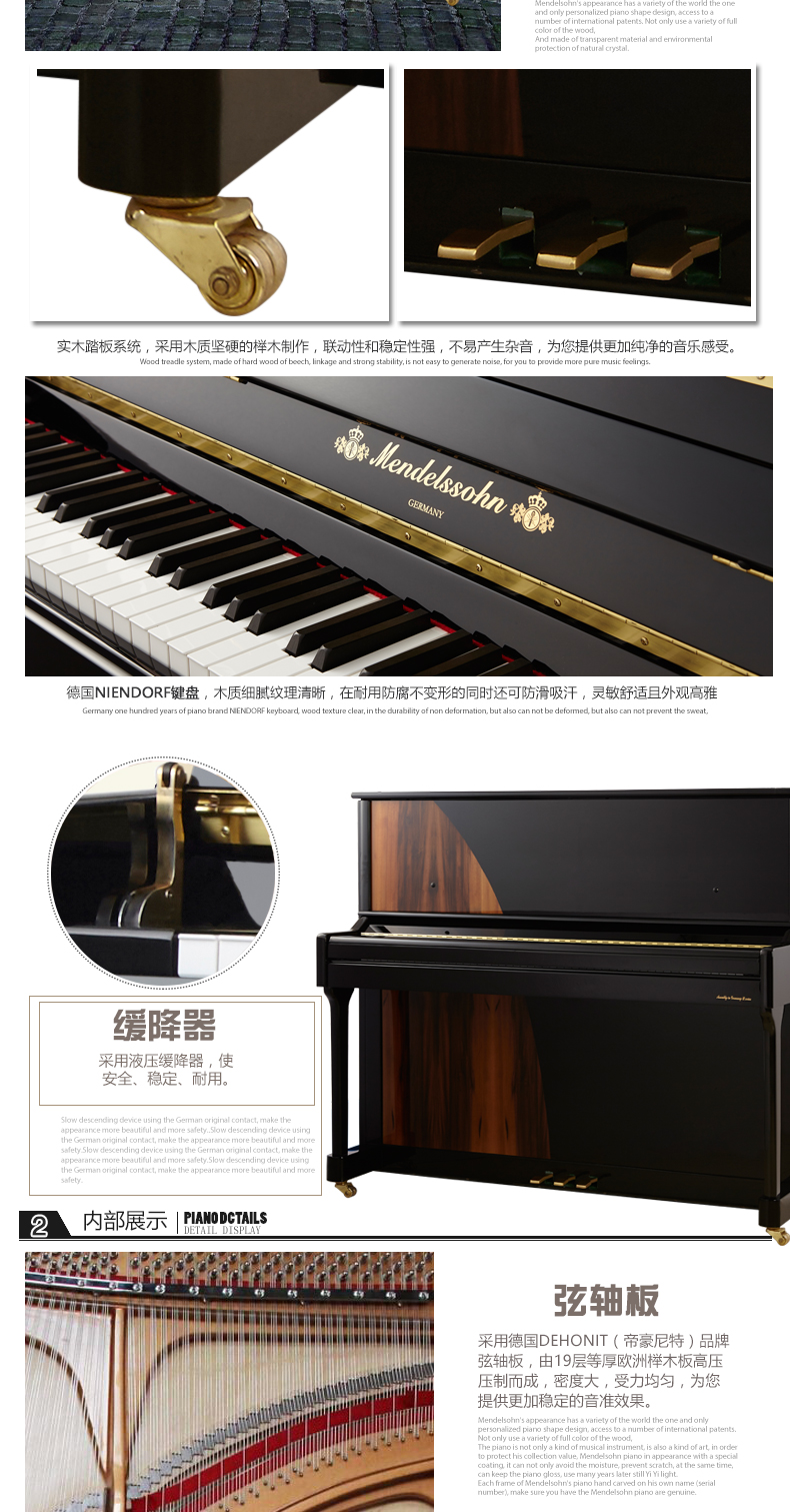踏板系統(tǒng):實(shí)木踏板系統(tǒng),采用木質(zhì)堅(jiān)硬的櫸木制作,聯(lián)動(dòng)性和穩(wěn)定性強(qiáng),經(jīng)久耐用,腳感舒適,不易產(chǎn)生雜音,為您提供更加純凈的音樂感受。