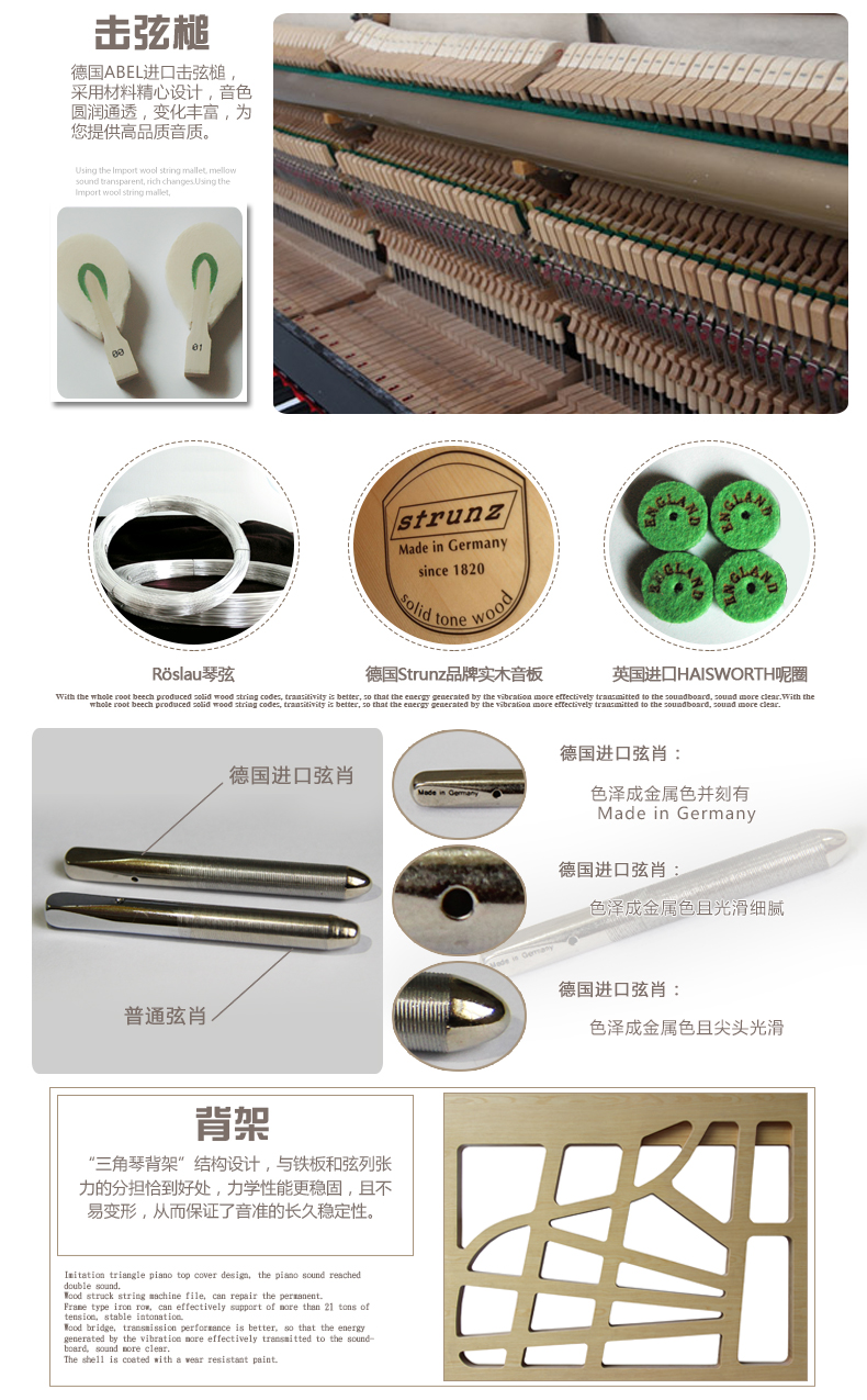 琴弦:德國(guó)Röslau品牌琴弦,直徑均勻,含碳量低、純度高、張力強(qiáng),琴弦張力可達(dá)到30噸,彈性和韌性具佳,為您提供優(yōu)美、純凈的音色。