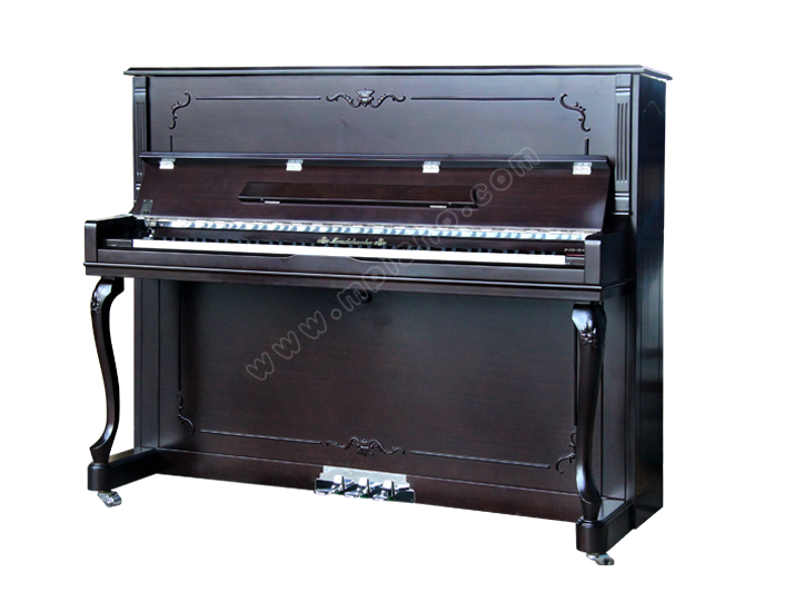 胡桃木色亞光琴身,大搖蓋,單琴耳,小譜架,大弧形彎腿雕有線形花紋,上、下門刻有精致的花枝、花蔓,盡顯浪漫、優(yōu)雅。
