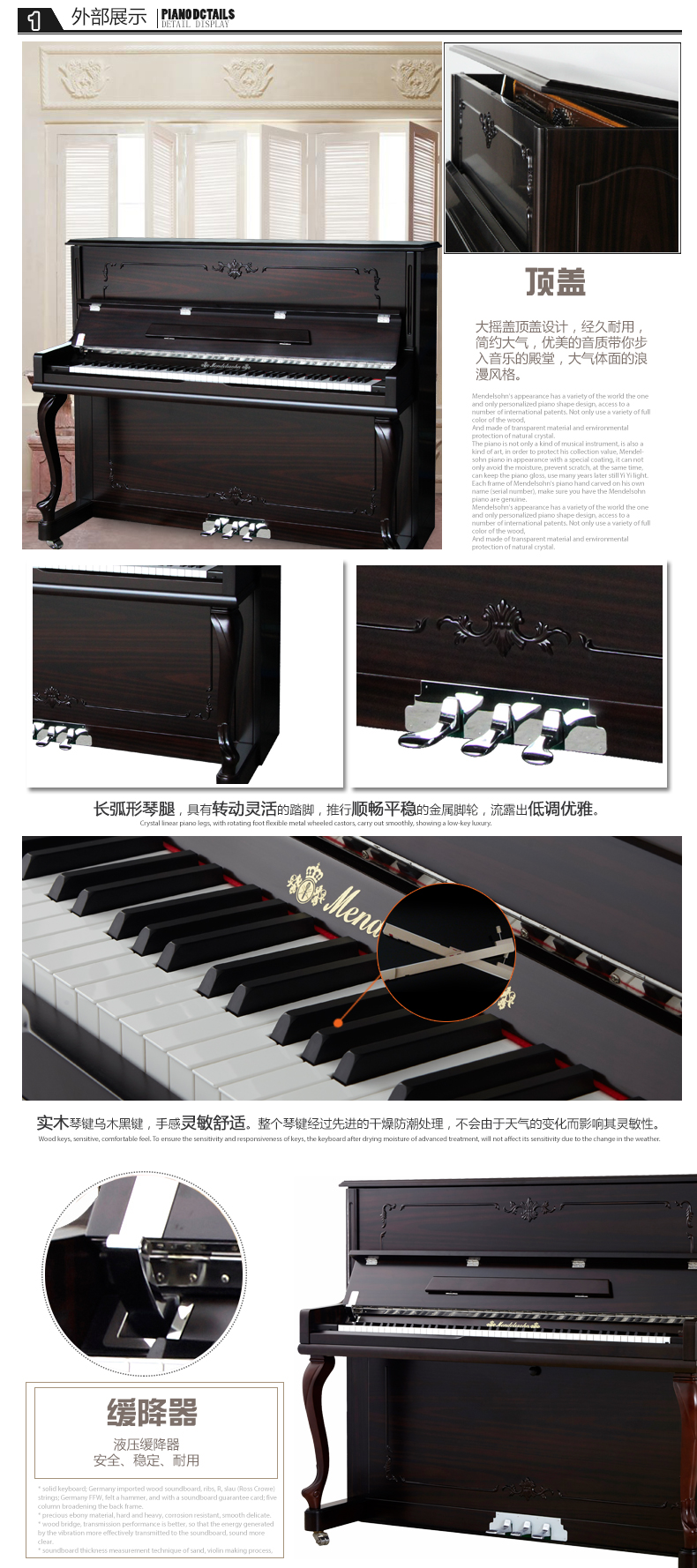 德國R?slau(羅斯勞)琴弦;德國FFW擊弦槌;德國原裝進口音板;松實木鍵盤、烏木黑鍵,令手感更加舒適、靈敏。