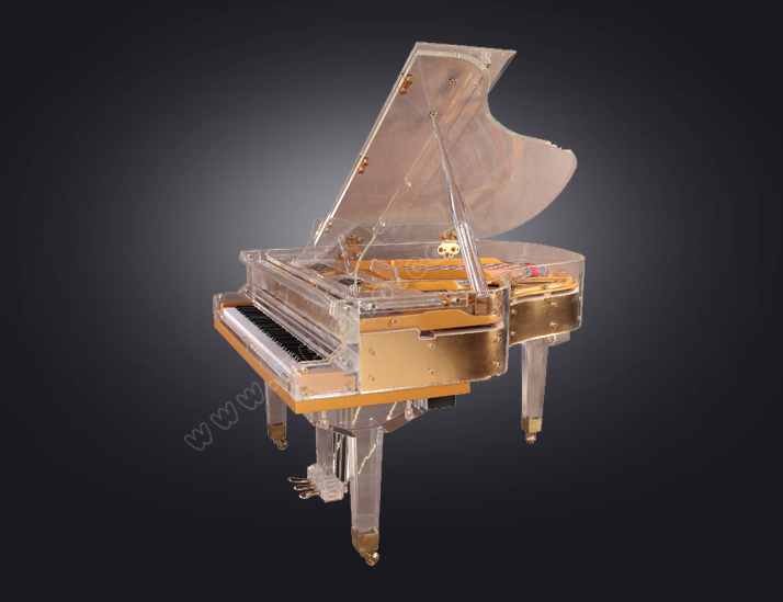 采用現代高科技環保材料,琴身通體晶瑩剔透、炫目璀璨。流暢舒展的線條,水晶透明的直琴腿,搭配簡潔大氣的水晶譜架,每一處細節都彰顯出澄凈的靈氣和王者的尊貴,宛若一座夢幻水晶宮殿,承載著音樂和夢想,任琴聲回蕩在湛藍純凈的天空。