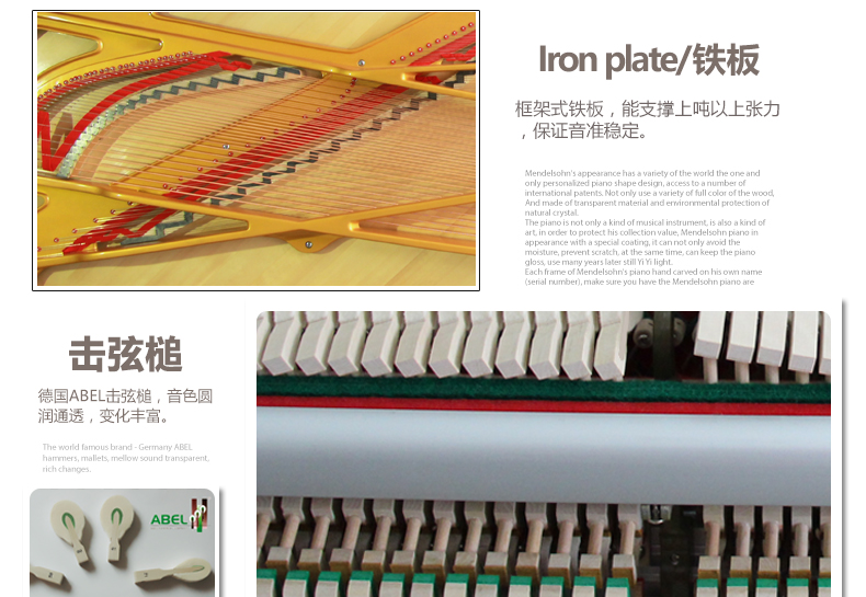 德國R?slau(羅斯勞)琴弦、德國原裝進口的ABEL擊弦槌、烏木黑鍵、德國原裝進口音板。